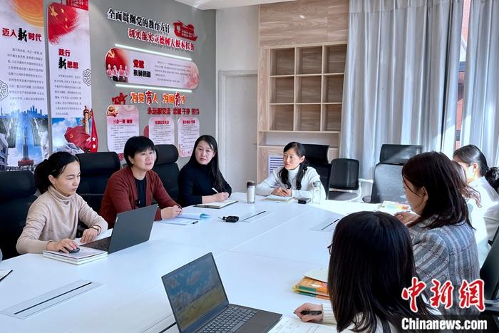 全國(guó)人大代表、寧夏銀川市二十一小學(xué)黨總支書記馬恒燕(左二)與銀川市二十一小學(xué)健康城分校教師交流。 李佩珊 攝