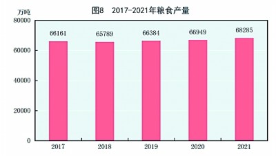 全年糧食產(chǎn)量68285萬噸,比上年增加1336萬噸,增產(chǎn)2.0%。其中,夏糧產(chǎn)量14596萬噸,增產(chǎn)2.2%;早稻產(chǎn)量2802萬噸,增產(chǎn)2.7%;秋糧產(chǎn)量50888萬噸,增產(chǎn)1.9%。全年谷物產(chǎn)量63276萬噸,比上年增產(chǎn)2.6%。其中,稻谷產(chǎn)量21284萬噸,增產(chǎn)0.5%;小麥產(chǎn)量13695萬噸,增產(chǎn)2.0%;玉米產(chǎn)量27255萬噸,增產(chǎn)4.6%。(見圖8)