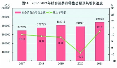 全年社會(huì)消費(fèi)品零售總額440823億元,比上年增長12.5%。按經(jīng)營地統(tǒng)計(jì),城鎮(zhèn)消費(fèi)品零售額381558億元,增長12.5%;鄉(xiāng)村消費(fèi)品零售額59265億元,增長12.1%。按消費(fèi)類型統(tǒng)計(jì),商品零售額393928億元,增長11.8%;餐飲收入額46895億元,增長18.6%。(見圖14)