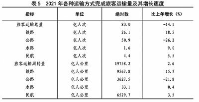 全年旅客運(yùn)輸總量83億人次,比上年下降14.1%。旅客運(yùn)輸周轉(zhuǎn)量19758億人公里,增長2.6%。(見表5)