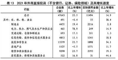 全年外商直接投資(不含銀行、證券、保險(xiǎn)領(lǐng)域)新設(shè)立企業(yè)47643家,比上年增長23.5%。實(shí)際使用外商直接投資金額11494億元,增長14.9%,折1735億美元,增長20.2%。其中“一帶一路”沿線國家對(duì)華直接投資(含通過部分自由港對(duì)華投資)新設(shè)立企業(yè)5336家,增長24.3%;對(duì)華直接投資金額743億元,增長29.4%,折112億美元,增長36.0%。全年高技術(shù)產(chǎn)業(yè)實(shí)際使用外資3469億元,增長17.1%,折522億美元,增長22.1%。(見表13)