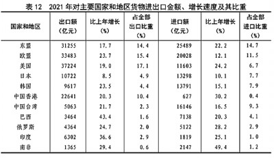 全年貨物進(jìn)出口總額391009億元,比上年增長21.4%。其中,出口217348億元,增長21.2%;進(jìn)口173661億元,增長21.5%。貨物進(jìn)出口順差43687億元,比上年增加7344億元。對(duì)“一帶一路”[44]沿線國家進(jìn)出口總額115979億元,比上年增長23.6%。其中,出口65924億元,增長21.5%;進(jìn)口50055億元,增長26.4%。(見圖16)(見表9)(見表10)(見表11)(見表12)