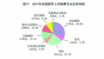 全年全國居民人均消費(fèi)支出24100元,比上年增長13.6%,扣除價(jià)格因素,實(shí)際增長12.6%。其中,人均服務(wù)性消費(fèi)支出[56]10645元,比上年增長17.8%,占居民人均消費(fèi)支出的比重為44.2%。按常住地分,城鎮(zhèn)居民人均消費(fèi)支出30307元,增長12.2%,扣除價(jià)格因素,實(shí)際增長11.1%;農(nóng)村居民人均消費(fèi)支出15916元,增長16.1%,扣除價(jià)格因素,實(shí)際增長15.3%。全國居民恩格爾系數(shù)為29.8%,其中城鎮(zhèn)為28.6%,農(nóng)村為32.7%。(見圖18)(見圖19)