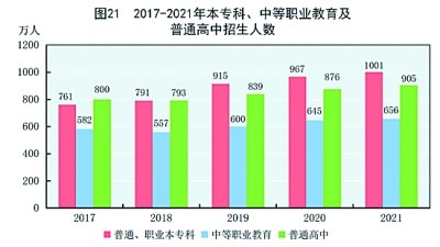 全年研究生教育招生117.7萬人,在學(xué)研究生333.2萬人,畢業(yè)生77.3萬人。普通、職業(yè)本專科[65]招生1001.3萬人,在校生3496.1萬人,畢業(yè)生826.5萬人。中等職業(yè)教育[66]招生656.2萬人,在校生1738.5萬人,畢業(yè)生484.1萬人。普通高中招生905.0萬人,在校生2605.0萬人,畢業(yè)生780.2萬人。初中招生1705.4萬人,在校生5018.4萬人,畢業(yè)生1587.1萬人。普通小學(xué)招生1782.6萬人,在校生10779.9萬人,畢業(yè)生1718.0萬人。特殊教育招生14.9萬人,在校生92.0萬人,畢業(yè)生14.6萬人。學(xué)前教育在園幼兒4805.2萬人。九年義務(wù)教育鞏固率為95.4%,高中階段毛入學(xué)率為91.4%。(見圖21)