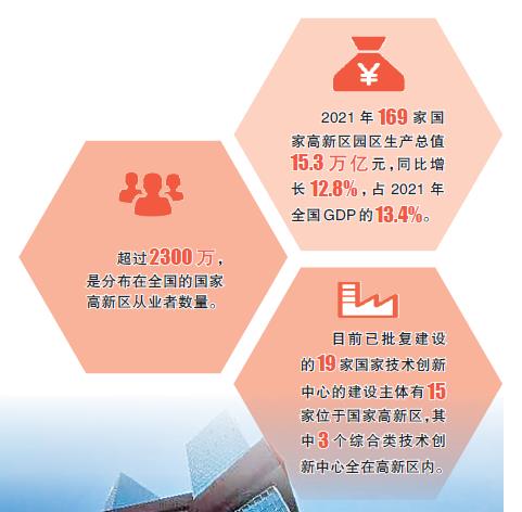 來(lái)自科技部火炬中心的數(shù)據(jù)顯示:2021年169家國(guó)家高新區(qū)園區(qū)生產(chǎn)總值15.3萬(wàn)億元,同比增長(zhǎng)12.8%,占2021年全國(guó)GDP的13.4%。