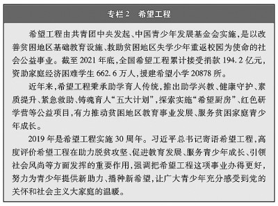 教育機(jī)會(huì)更加均等。中國(guó)教育事業(yè)優(yōu)先發(fā)展不斷深化,中國(guó)青年享有更加平等、更高質(zhì)量的教育機(jī)會(huì)。2021年,中國(guó)義務(wù)教育鞏固率達(dá)95.4%;高中階段毛入學(xué)率達(dá)91.4%;高等教育毛入學(xué)率達(dá)57.8%、在學(xué)總規(guī)模達(dá)4430萬(wàn)人,居世界第一,越來越多的青年打開了通往成功成才大門的重要路徑。覆蓋學(xué)前教育至研究生教育的學(xué)生資助政策體系建成且日趨完善,2020年資助資金總額超過2400億元、資助學(xué)生近1.5億人次,實(shí)現(xiàn)“三個(gè)全覆蓋”②。義務(wù)教育階段進(jìn)城務(wù)工人員隨遷子女、農(nóng)村和貧困地區(qū)學(xué)生等群體受教育權(quán)益得到充分保障。2020年,85.8%的進(jìn)城務(wù)工人員隨遷子女在公辦學(xué)校就讀或享受政府購(gòu)買學(xué)位服務(wù);2012年至2021年,農(nóng)村和貧困地區(qū)重點(diǎn)高校專項(xiàng)招生計(jì)劃定向招生超過82萬(wàn)人,讓更多的青年公平享有接受更好教育的機(jī)會(huì),阻斷貧困的代際傳遞。