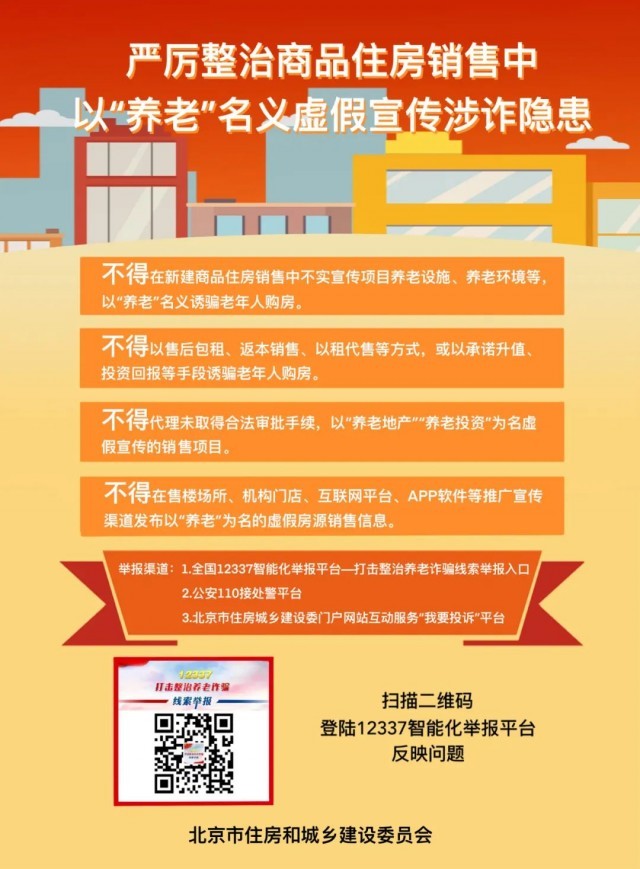 據(jù)“安居北京”公眾號消息,北京住建委發(fā)布提示,不得在新建商品住房銷售中不實(shí)宣傳項(xiàng)目養(yǎng)老設(shè)施、養(yǎng)老環(huán)境等,以“養(yǎng)老”名義誘騙老年人購房。不得以售后包租、返本銷售、以租代售等方式,或以承諾升值、投資回報(bào)等手段誘騙老年人購房。