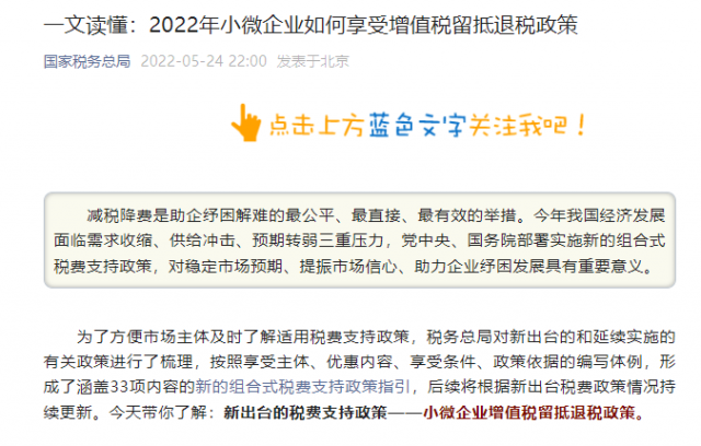 為了方便市場主體及時了解適用稅費支持政策,稅務總局對新出臺的和延續(xù)實施的有關政策進行了梳理,按照享受主體、優(yōu)惠內(nèi)容、享受條件、政策依據(jù)的編寫體例,形成了涵蓋33項內(nèi)容的新的組合式稅費支持政策指引,后續(xù)將根據(jù)新出臺稅費政策情況持續(xù)更新。今天帶你了解:新出臺的稅費支持政策——小微企業(yè)增值稅留抵退稅政策。