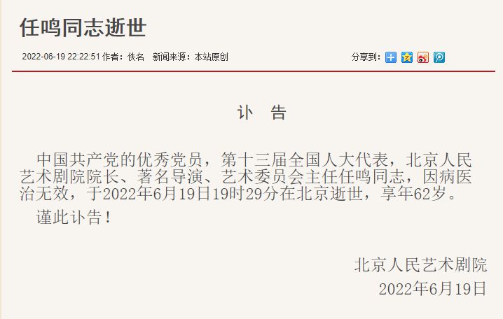 中國共產(chǎn)黨的優(yōu)秀黨員,第十三屆全國人大代表,北京人民藝術(shù)劇院院長、著名導(dǎo)演、藝術(shù)委員會主任任鳴同志,因病醫(yī)治無效,于2022年6月19日19時29分在北京逝世,享年62歲。