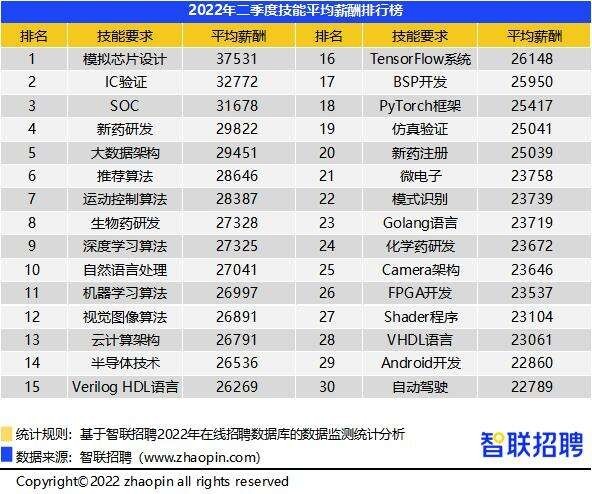 對于技術(shù)性強的職業(yè),有時技能要求甚至比學(xué)歷要求更重要,掌握其關(guān)鍵技能成為獲取高薪的關(guān)鍵。二季度高薪技能榜中,芯片設(shè)計、新藥研發(fā)、大數(shù)據(jù)架構(gòu)、算法等穩(wěn)居前位。模擬芯片設(shè)計以37531元的平均月薪位居首位,IC驗證、SOC技能的薪資水平也較高。