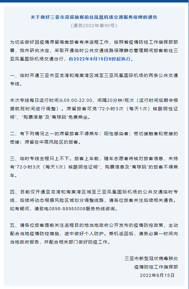8月15日,海南三亞市新型冠狀病毒肺炎疫情防控工作指揮部發(fā)布通告,開(kāi)通滯留旅客前往鳳凰機(jī)場(chǎng)公交專線,詳情如下:
