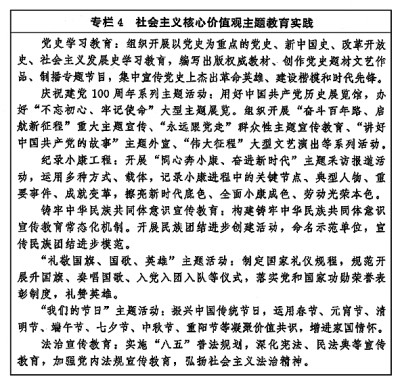 持續(xù)深化社會(huì)主義核心價(jià)值觀宣傳教育,增進(jìn)認(rèn)知認(rèn)同、樹立鮮明導(dǎo)向、強(qiáng)化示范帶動(dòng)。堅(jiān)持貫穿結(jié)合融入、落細(xì)落小落實(shí),把社會(huì)主義核心價(jià)值觀要求融入日常生活,融入法治建設(shè)。推動(dòng)理想信念教育常態(tài)化制度化,筑牢黨員干部、青少年等重點(diǎn)群體的理想信念之基。圍繞“七一”、“八一”、“十一”等重大時(shí)間節(jié)點(diǎn),依托革命歷史類紀(jì)念設(shè)施、遺址和愛國主義教育基地等載體,加強(qiáng)愛國主義、集體主義、社會(huì)主義教育,弘揚(yáng)黨和人民在各個(gè)歷史時(shí)期奮斗中形成的偉大精神。加強(qiáng)公益廣告宣傳。統(tǒng)籌開展誠信教育、勤儉節(jié)約教育、勞動(dòng)創(chuàng)造幸福主題宣傳教育。強(qiáng)化祖國統(tǒng)一和民族團(tuán)結(jié)進(jìn)步宣傳教育,深化“一國兩制”實(shí)踐教育,強(qiáng)化全民國防教育,促進(jìn)平安中國建設(shè)。