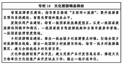 適應(yīng)大眾旅游時(shí)代新要求,推進(jìn)旅游為民,推動(dòng)構(gòu)建類型多樣、分布均衡、特色鮮明、品質(zhì)優(yōu)良的旅游供給體系,推動(dòng)文化和旅游業(yè)態(tài)融合、產(chǎn)品融合、市場(chǎng)融合。提升旅游演藝、文化遺產(chǎn)旅游、文化主題酒店、特色節(jié)慶展會(huì)等品質(zhì),支持建設(shè)集文化創(chuàng)意、旅游休閑等于一體的文化和旅游綜合體。依托革命博物館、黨史館、紀(jì)念館、革命遺址遺存遺跡等,打造紅色旅游經(jīng)典景區(qū)和經(jīng)典線路。利用鄉(xiāng)村文化傳統(tǒng)和資源,發(fā)展鄉(xiāng)村旅游。加強(qiáng)對(duì)當(dāng)代社會(huì)主義建設(shè)成就的旅游開發(fā),深入挖掘重大工程項(xiàng)目的精神內(nèi)涵,發(fā)展特色旅游。加強(qiáng)對(duì)工業(yè)遺產(chǎn)資源的活化利用,開發(fā)旅游用品、特色旅游商品,培育旅游裝備制造業(yè),發(fā)展工業(yè)旅游。推動(dòng)旅游與現(xiàn)代生產(chǎn)生活有機(jī)結(jié)合,加快發(fā)展度假休閑旅游、康養(yǎng)旅游、研學(xué)實(shí)踐活動(dòng)等,打造一批國家全域旅游示范區(qū)、A級(jí)旅游景區(qū)、國家級(jí)旅游度假區(qū)、國家精品旅游帶、國家旅游風(fēng)景道、特色旅游目的地、特色旅游功能區(qū)、城市綠道、騎行公園和慢行系統(tǒng)。大力發(fā)展智慧旅游,推進(jìn)智慧景區(qū)、度假區(qū)建設(shè)。