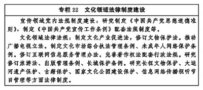 創(chuàng)新文化宏觀管理體制,堅(jiān)持和加強(qiáng)黨對(duì)宣傳思想文化工作的全面領(lǐng)導(dǎo),把黨的領(lǐng)導(dǎo)落實(shí)到國家文化治理各領(lǐng)域各方面各環(huán)節(jié)。深化文化領(lǐng)域行政體制改革,推進(jìn)“放管服”改革,轉(zhuǎn)變政府職能。完善黨委和政府監(jiān)管有機(jī)結(jié)合、宣傳部門有效主導(dǎo)的國有文化資產(chǎn)管理體制機(jī)制,推進(jìn)管人管事管資產(chǎn)管導(dǎo)向相統(tǒng)一。建立健全傳統(tǒng)媒體和新興媒體一體化管理的工作機(jī)制,進(jìn)一步加強(qiáng)網(wǎng)絡(luò)綜合治理體系建設(shè)。建立健全社科學(xué)術(shù)社團(tuán)工作協(xié)調(diào)機(jī)制,加強(qiáng)文化領(lǐng)域行業(yè)組織建設(shè)。研究制定加強(qiáng)宣傳文化領(lǐng)域法治建設(shè)的意見,加快文化立法進(jìn)程,全面推進(jìn)依法行政。完善文化市場(chǎng)綜合執(zhí)法體制。完善文化產(chǎn)業(yè)統(tǒng)計(jì)制度。