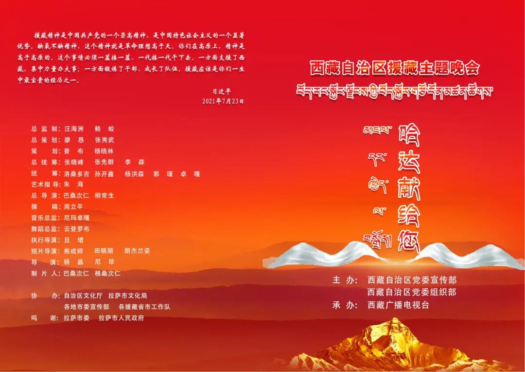 為展現(xiàn)援藏工作成就,弘揚(yáng)援藏精神,表達(dá)西藏各族干部群眾對(duì)習(xí)近平總書記和黨中央的親切關(guān)懷、全國(guó)人民無(wú)私支援特別是對(duì)援藏干部人才的敬意和感恩之情,由自治區(qū)黨委宣傳部、自治區(qū)黨委組織部共同主辦的援藏主題晚會(huì)《哈達(dá)獻(xiàn)給您》將于8月18日晚,在西藏衛(wèi)視(《西藏新聞聯(lián)播》后)、西藏藏語(yǔ)衛(wèi)視(19:30左右)播出,自治區(qū)七地市廣播電視臺(tái)將同步播出(地市《新聞聯(lián)播》后)。