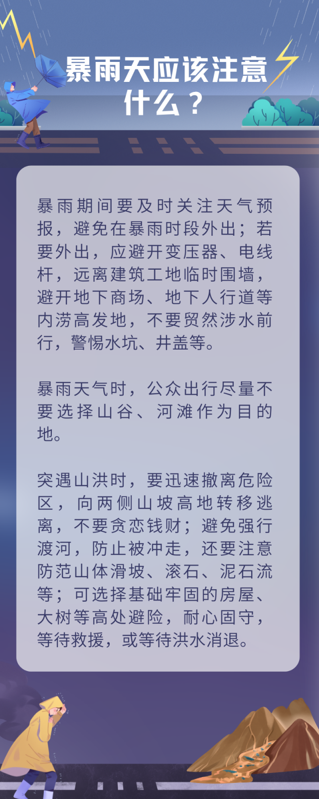 暴雨天應(yīng)該注意什么?業(yè)內(nèi)專家建議,暴雨期間要及時(shí)關(guān)注天氣預(yù)報(bào),避免在暴雨時(shí)段外出;若要外出,應(yīng)避開變壓器、電線桿,遠(yuǎn)離建筑工地臨時(shí)圍墻,避開地下商場(chǎng)、地下人行道等內(nèi)澇高發(fā)地,不要貿(mào)然涉水前行,警惕水坑、井蓋等。