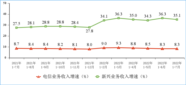 1—7月電信業(yè)務收入、總量同比分別增長8.3%和22.2%