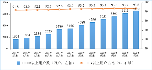固定寬帶接入用戶規(guī)模穩(wěn)步增長,千兆用戶數(shù)持續(xù)擴大。截至7月末,三家基礎電信企業(yè)的固定互聯(lián)網(wǎng)寬帶接入用戶總數(shù)達5.66億戶,比上年末凈增3070萬戶。其中,100Mbps及以上接入速率的固定互聯(lián)網(wǎng)寬帶接入用戶達5.31億戶,占總用戶數(shù)的93.8%,占比較上年末提升0.8個百分點;1000Mbps及以上接入速率的固定互聯(lián)網(wǎng)寬帶接入用戶達6570萬戶,比上年末凈增3112萬戶,占總用戶數(shù)的11.6%。