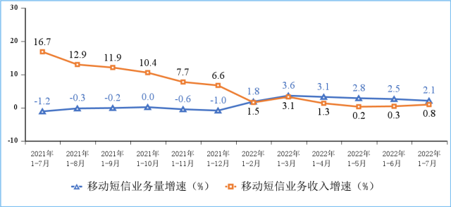 移動電話通話量小幅增長,移動短信業(yè)務收入增速回升。1—7月份,移動電話去話通話時長完成1.32萬億分鐘,同比增長1.1%;固定電話主叫通話時長完成483.5億分鐘,同比下降11.8%。1—7月份,全國移動短信業(yè)務量同比增長2.1%,移動短信業(yè)務收入同比增長0.8%,增速較上半年分別回落0.4個和提升0.5個百分點。