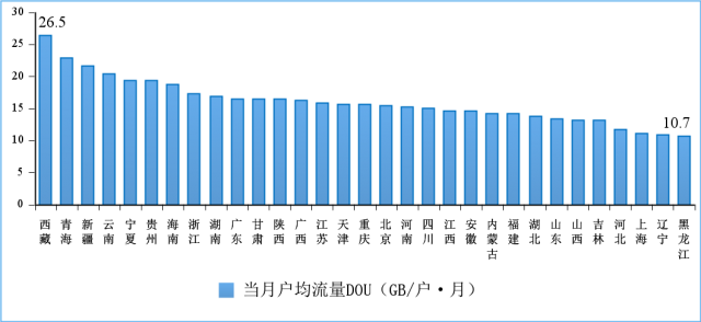 中部地區(qū)移動互聯(lián)網(wǎng)接入流量增速領先,西部部分省份DOU值居全國前列。1—7月份,東、中、西部和東北地區(qū)移動互聯(lián)網(wǎng)接入流量分別達到622.1億GB、330.6億GB、434.6億GB和75.5億GB,同比增長19.1%、20.5%、19.4%和12.5%。西藏、青海、新疆和云南4省7月當月戶均移動互聯(lián)網(wǎng)接入流量(DOU)超過20GB/戶·月;各省DOU值最高值與最低值之差為15.8GB/戶·月,差值較去年同期擴大2.4GB/戶·月。