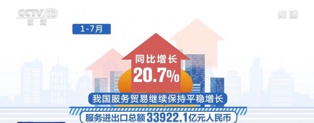 央視網(wǎng)消息:今年1—7月份,我國服務進出口總額達33922.1億元,我國服務貿(mào)易繼續(xù)保持平穩(wěn)增長。