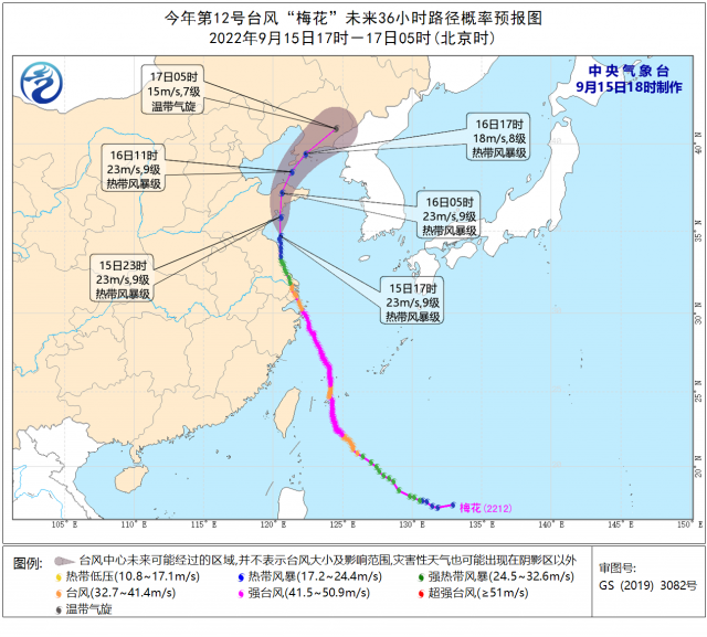 臺(tái)風(fēng)“梅花”移動(dòng)路徑。中央氣象臺(tái)9月15日18時(shí)制作