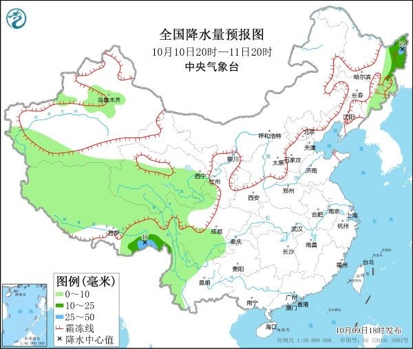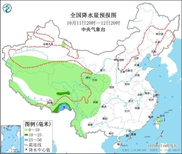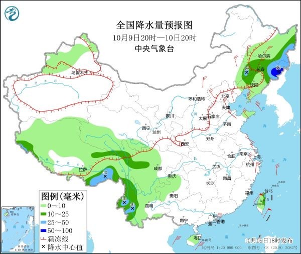 10月9日20時至10日20時,內(nèi)蒙東南部、遼寧西部和北部、吉林東南部等地有小到中雪或雨夾雪,局部有大雪或暴雪。內(nèi)蒙古東南部、黑龍江東部、吉林大部、遼寧西北部、西藏西南部和東部、云南西部等地部分地區(qū)有中到大雨,其中,吉林東部等地局地有暴雨(50~80毫米)。內(nèi)蒙古中東部、黑龍江西南部、吉林西部、遼寧、河北北部、天津、山東半島、江蘇東部、浙江中北部等地部分地區(qū)有4~6級風(fēng),陣風(fēng)7~8級(見圖2)。渤海、渤海海峽、黃海大部、東海西部、臺灣海峽、臺灣以東洋面、巴士海峽、南海北部、北部灣將有8~9級、陣風(fēng)10~11級的大風(fēng)。