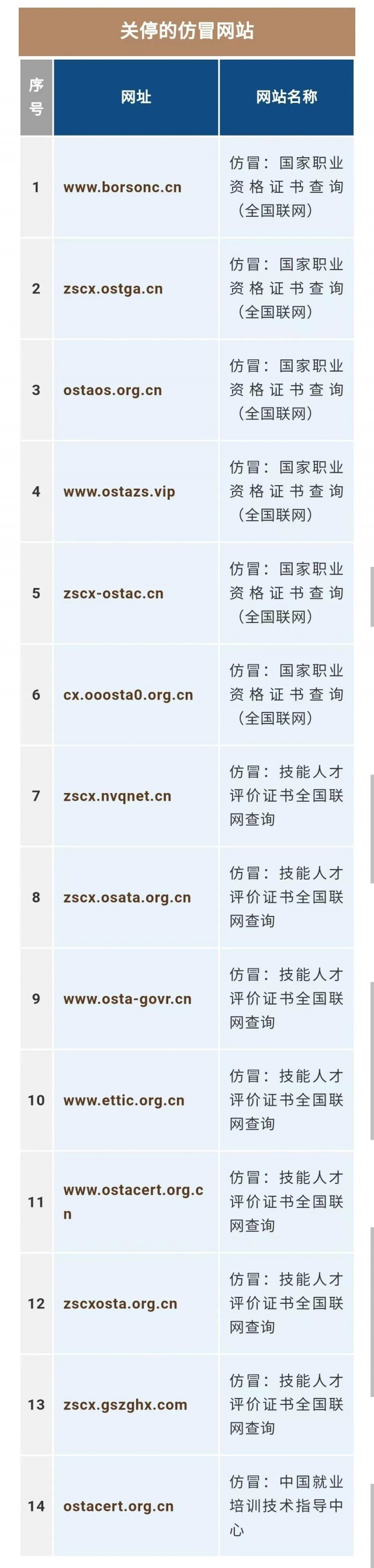 根據(jù)網(wǎng)絡(luò)巡查和群眾舉報情況,人力資源社會保障部聯(lián)合有關(guān)部門查實并關(guān)停了14個仿冒網(wǎng)站,其網(wǎng)站名稱、網(wǎng)址及頁面內(nèi)容與人力資源社會保障部技能類“職業(yè)資格證書”“職業(yè)技能等級證書”(以下簡稱技能類評價證書)查詢官方網(wǎng)站高度相似,容易誤導(dǎo)社會公眾。目前,上述14個網(wǎng)站均已被關(guān)停。