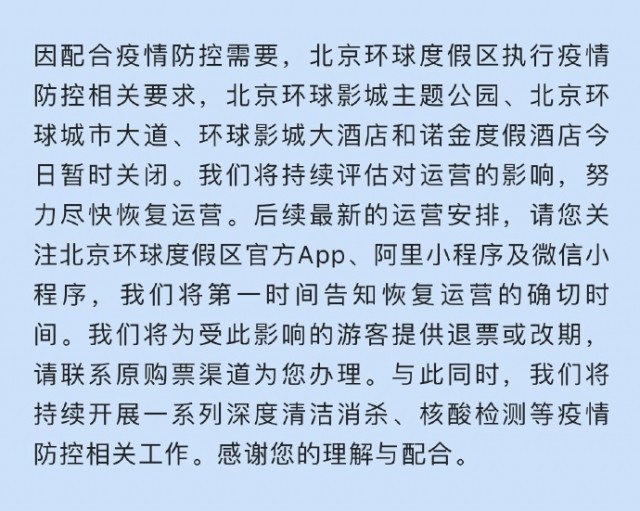 據(jù)@北京環(huán)球度假區(qū) 微博消息,因配合疫情防控需要,北京環(huán)球度假區(qū)執(zhí)行疫情防控相關(guān)要求,北京環(huán)球影城主題公園、北京環(huán)球城市大道、環(huán)球影城大酒店和諾金度假酒店今日暫時關(guān)閉。我們將持續(xù)評估對運(yùn)營的影響,努力盡快恢復(fù)運(yùn)營。后續(xù)最新的運(yùn)營安排,請您關(guān)注北京環(huán)球度假區(qū)官方App、阿里小程序及微信小程序,我們將第一時間告知恢復(fù)運(yùn)營的確切時間。我們將為受此影響的游客提供退票或改期,請聯(lián)系原購票渠道為您辦理。與此同時,我們將持續(xù)開展一系列深度清潔消殺、核酸檢測等疫情防控相關(guān)工作。感謝您的理解與配合。