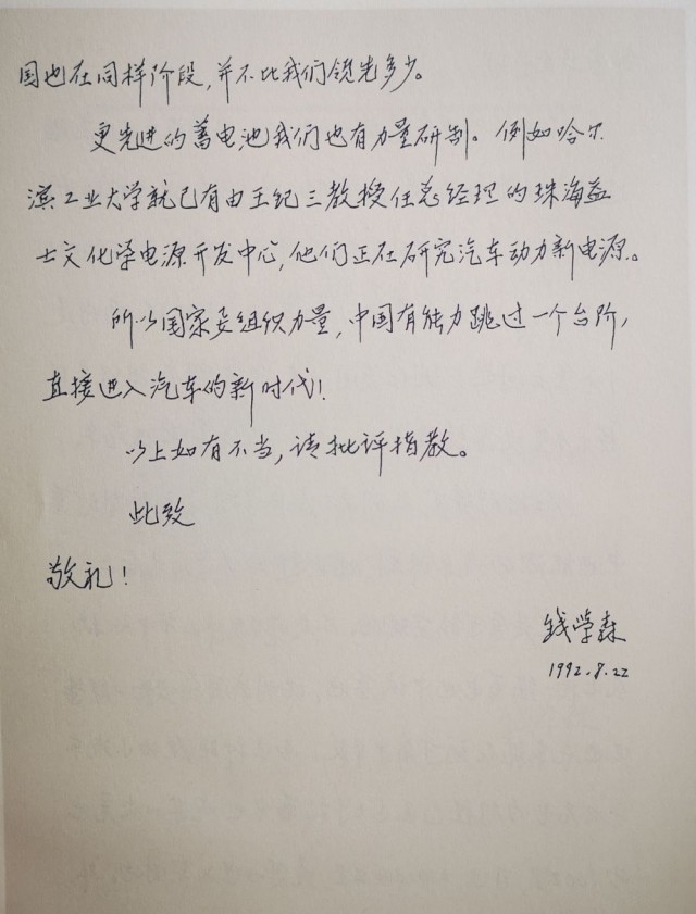 1992年8月22日,錢學(xué)森寫信,探討汽車工業(yè)。錢學(xué)森圖書館供圖