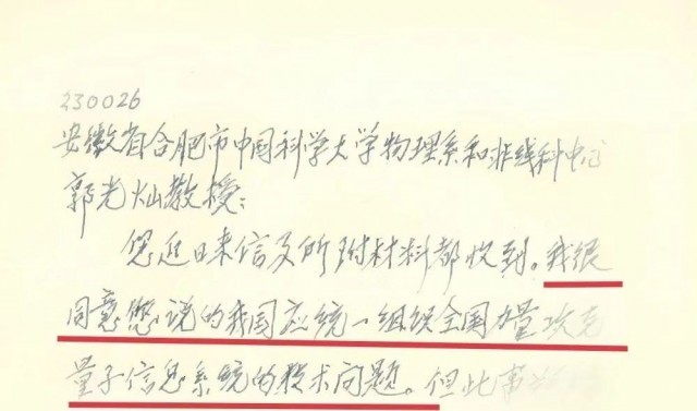 信中寫道:“我很同意您說的我國(guó)應(yīng)統(tǒng)一組織全國(guó)力量攻克量子信息系統(tǒng)的技術(shù)問題?!薄按耸玛P(guān)系到國(guó)家大事”,還就如何“組織全國(guó)力量”表達(dá)了看法。