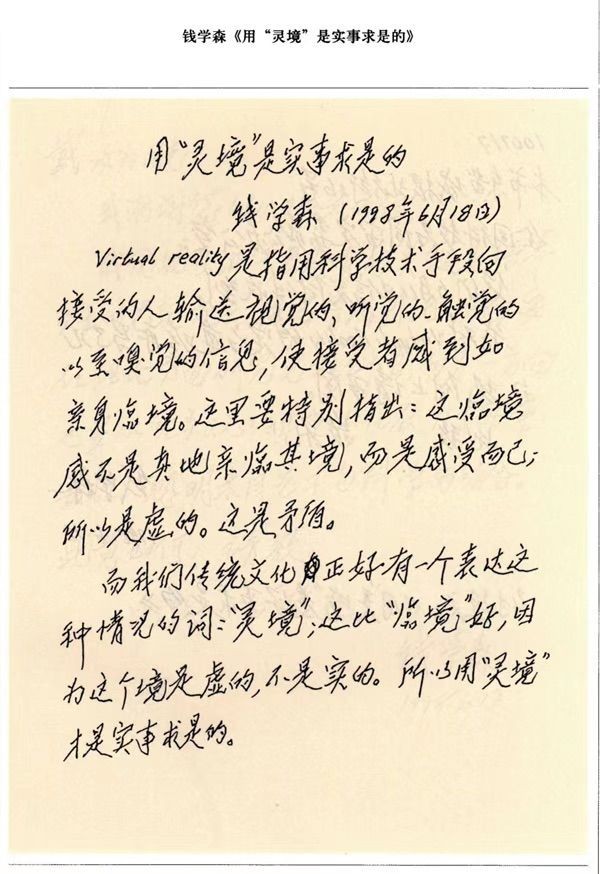 1998年6月18日,87歲的錢學(xué)森寫了一篇短文《用“靈境”是實(shí)事求是的》,其中寫道:“我們傳統(tǒng)文化正好有一個(gè)表達(dá)這種情況的詞‘靈境’;這比‘臨境’好,因?yàn)檫@個(gè)境是虛的,不是實(shí)的。”