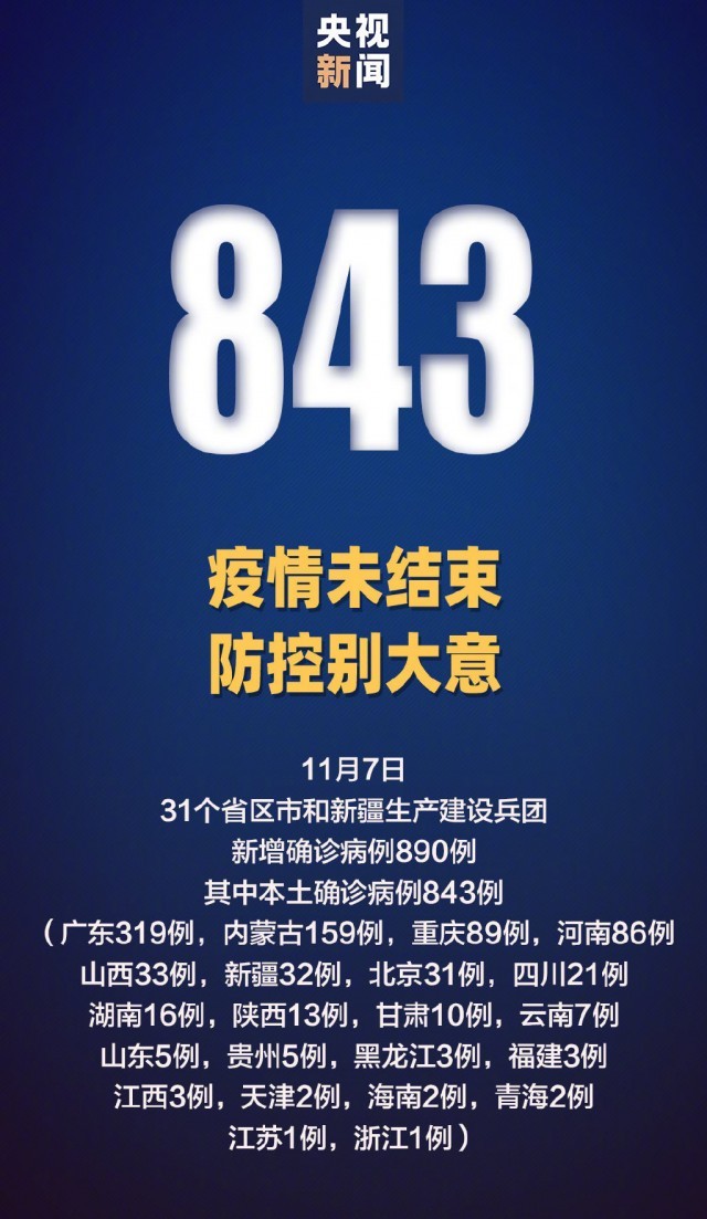 11月7日0—24時(shí),31個(gè)?。ㄗ灾螀^(qū)、直轄市)和新疆生產(chǎn)建設(shè)兵團(tuán)報(bào)告新增確診病例890例。其中境外輸入病例47例(福建12例,廣東12例,四川8例,北京5例,天津3例,上海3例,遼寧2例,江蘇1例,山東1例),含2例由無(wú)癥狀感染者轉(zhuǎn)為確診病例(廣東1例,四川1例);本土病例843例(廣東319例,內(nèi)蒙古159例,重慶89例,河南86例,山西33例,新疆32例,北京31例,四川21例,湖南16例,陜西13例,甘肅10例,云南7例,山東5例,貴州5例,黑龍江3例,福建3例,江西3例,天津2例,海南2例,青海2例,江蘇1例,浙江1例),含152例由無(wú)癥狀感染者轉(zhuǎn)為確診病例(廣東121例,甘肅9例,四川7例,北京3例,重慶3例,福建2例,湖南2例,陜西2例,山西1例,黑龍江1例,浙江1例)。無(wú)新增死亡病例。無(wú)新增疑似病例。
