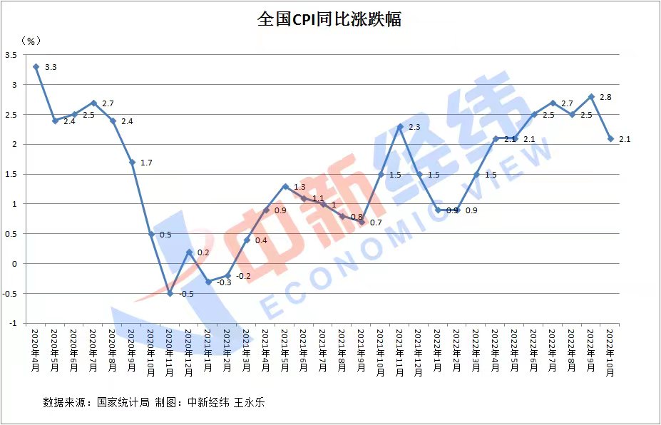 國家統(tǒng)計局數(shù)據(jù)顯示,2022年10月,全國CPI環(huán)比上漲0.1%,同比上漲2.1%。同比漲幅較9月明顯回落,且連續(xù)第4個月低于市場預(yù)期。