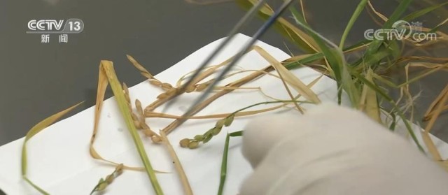 總臺央視記者 張春玲:在中科院空間應用中心,實驗人員正在對從太空返回的植物種子進行相關處理。他們要及時的進行分解和化學固化處理,在他們面前所擺放著這次太空中三粒植物種子收獲的多株稻穗,可謂是碩果累累。