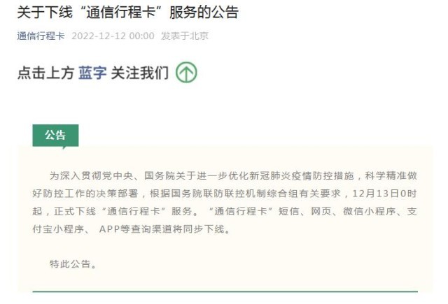 中國信息通信研究院12日通過微信公眾號發(fā)布公告稱,為深入貫徹黨中央、國務院關于進一步優(yōu)化新冠肺炎疫情防控措施,科學精準做好防控工作的決策部署,根據(jù)國務院聯(lián)防聯(lián)控機制綜合組有關要求,12月13日0時起,正式下線“通信行程卡”服務。“通信行程卡”短信、網(wǎng)頁、微信小程序、支付寶小程序、 APP等查詢渠道將同步下線。