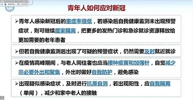 青年人如何應對新冠?鐘南山說,青年人感染新冠后的重癥率非常低,如果感染,建議居家隔離,把更多的發(fā)熱門診和急診資源釋放給更加需要的老年患者。如果自我監(jiān)測后出現(xiàn)了可疑的癥狀,仍然需要及時就近就診。在疫情高峰期,與老人同住者也應當接種疫苗和加強針,自覺減少非必要外出和聚集,外出時做好自我防護,避免感染。他說,“我的外孫女前幾天得了,3天就恢復了?!?/p>