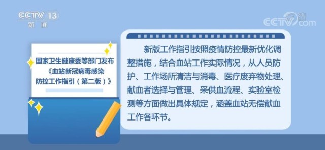 央視網(wǎng)消息:為落實進一步優(yōu)化新冠肺炎疫情防控措施相關(guān)要求,指導(dǎo)采供血機構(gòu)科學(xué)有效做好無償獻血工作,國家衛(wèi)生健康委辦公廳、中央軍委后勤保障部衛(wèi)生局組織專家對2021年印發(fā)的《血站新冠肺炎疫情常態(tài)化防控工作指引》進行修訂,形成《血站新冠病毒感染防控工作指引(第二版)》,指導(dǎo)采供血機構(gòu)切實做好新形勢下疫情防控工作,保障血站工作人員和獻血者安全,實現(xiàn)血液安全供應(yīng)。