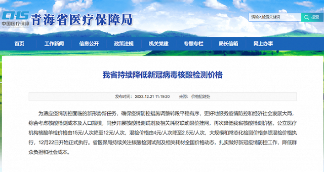 據(jù)青海省醫(yī)療保障局網(wǎng)站消息,為適應疫情防控面臨的新形勢新任務,確保疫情防控措施調(diào)整轉(zhuǎn)段平穩(wěn)有序,更好地服務疫情防控和經(jīng)濟社會發(fā)展大局,綜合考慮核酸檢測成本及人口規(guī)模,同步開展核酸檢測試劑及相關耗材聯(lián)動限價掛網(wǎng),再次降低青海省核酸檢測價格,公立醫(yī)療機構(gòu)核酸單檢價格由15元/人次降至12元/人次,混檢價格由4元/人次降至2.5元/人次,大規(guī)模和常態(tài)化檢測價格參照混檢價格執(zhí)行,12月22日開始正式執(zhí)行。省醫(yī)保局持續(xù)關注核酸檢測試劑及相關耗材全國價格動態(tài),扎實做好新冠疫情防控工作,降低群眾負擔和社會成本。