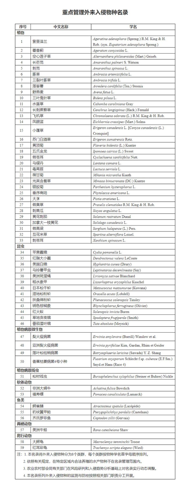 中新網(wǎng)12月20日電 據(jù)農(nóng)業(yè)農(nóng)村部網(wǎng)站20日消息,根據(jù)《中華人民共和國(guó)生物安全法》,農(nóng)業(yè)農(nóng)村部會(huì)同自然資源部、生態(tài)環(huán)境部、住房和城鄉(xiāng)建設(shè)部、海關(guān)總署和國(guó)家林草局組織制定了《重點(diǎn)管理外來(lái)入侵物種名錄》,包含鱷雀鱔、美洲牛蛙等59種外來(lái)入侵物種?!吨攸c(diǎn)管理外來(lái)入侵物種名錄》自2023年1月1日起施行。(中新財(cái)經(jīng))