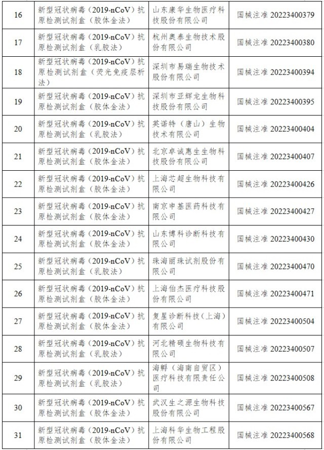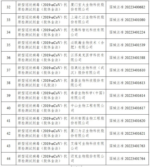 12月22日,經(jīng)國家藥監(jiān)局審查,批準艾維可生物科技有限公司和邁克生物股份有限公司的2個新冠病毒抗原檢測試劑產(chǎn)品。截至目前,國家藥監(jiān)局已批準44個新冠病毒抗原檢測試劑產(chǎn)品。