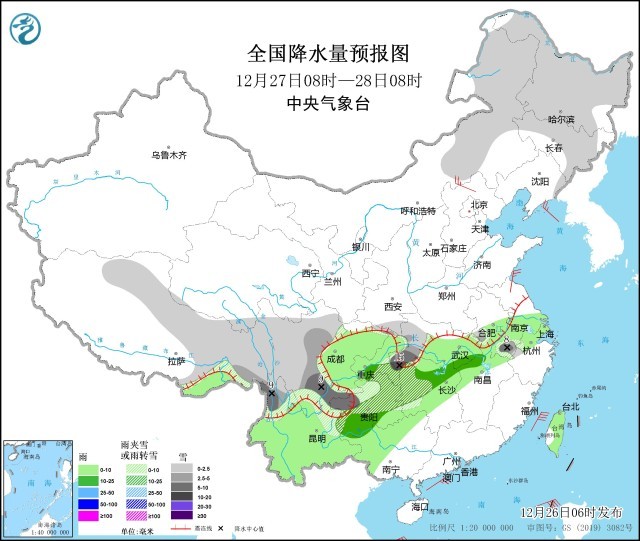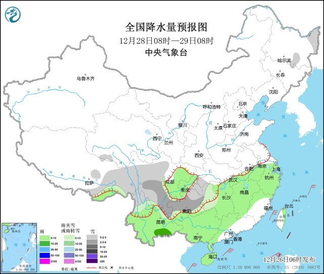 預(yù)計(jì)今天夜間至29日,南方地區(qū)將出現(xiàn)一次雨雪天氣過程,西藏東部、云南北部、川西高原、重慶東南部、貴州、湖南西部、湖北西部、安徽南部、浙江西北部等地將有小到中雪或雨夾雪,貴州中部和東部、湖南西部局地大到暴雪,貴州西部局地有凍雨;四川盆地、云南中南部、湖南南部、江西大部、浙江大部、福建北部以及廣西、廣東北部等地有小雨,局地中雨;主要降水時(shí)段為27日至28日。