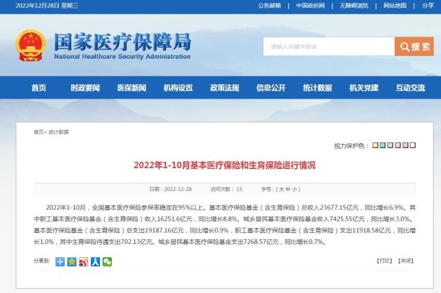 央視網(wǎng)消息:國家醫(yī)療保障局網(wǎng)站12月28日消息,2022年1-10月,全國基本醫(yī)療保險參保率穩(wěn)定在95%以上?;踞t(yī)療保險基金(含生育保險)總收入23677.15億元,同比增長6.9%。其中職工基本醫(yī)療保險基金(含生育保險)收入16251.6億元,同比增長8.8%。城鄉(xiāng)居民基本醫(yī)療保險基金收入7425.55億元,同比增長3.0%?;踞t(yī)療保險基金(含生育保險)總支出19187.16億元,同比增長0.9%,職工基本醫(yī)療保險基金(含生育保險)支出11918.58億元,同比增長1.0%,其中生育保險待遇支出702.13億元。城鄉(xiāng)居民基本醫(yī)療保險基金支出7268.57億元,同比增長0.7%。