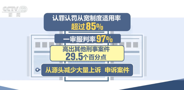 全面準確貫徹寬嚴相濟刑事政策,深入落實少捕慎訴慎押刑事司法政策,認罪認罰從寬制度適用率超過85%,一審服判率97%,高出其他刑事案件29.5個百分點,從源頭減少了大量上訴、申訴案件。