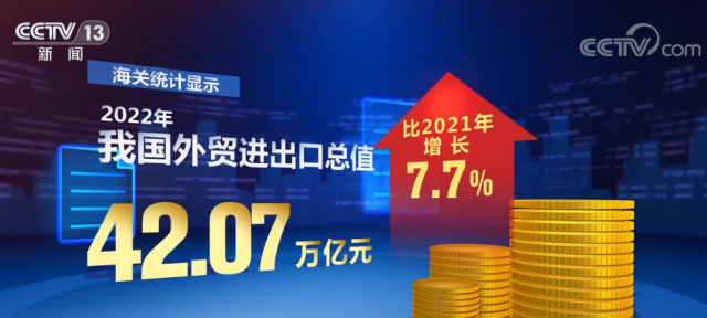 海關統(tǒng)計顯示,2022年,我國外貿進出口總值42.07萬億元,比2021年增長7.7%。其中,出口23.97萬億元,增長10.5%;進口18.1萬億元,增長4.3%。