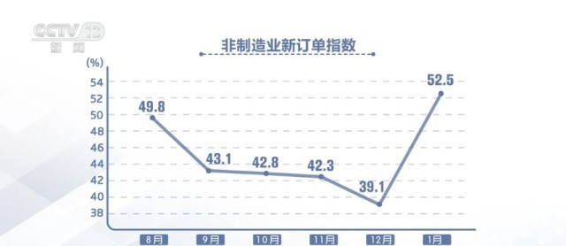 1月份中國(guó)非制造業(yè)商務(wù)活動(dòng)指數(shù)為54.4%,較上月上升12.8個(gè)百分點(diǎn),結(jié)束連續(xù)6個(gè)月下降走勢(shì);新訂單指數(shù)為52.5%,較上月上升13.4個(gè)百分點(diǎn),結(jié)束連續(xù)4個(gè)月下降走勢(shì)。非制造業(yè)供需呈現(xiàn)加速回升跡象。
