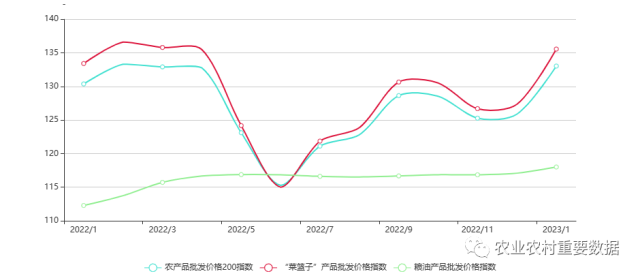 央視網(wǎng)消息:據(jù)農(nóng)業(yè)農(nóng)村重要數(shù)據(jù)公眾號(hào)消息,2023年1月,全國(guó)農(nóng)產(chǎn)品批發(fā)價(jià)格200指數(shù)為133.04,環(huán)比上漲7.16個(gè)點(diǎn), 同比上漲2.66個(gè)點(diǎn);菜籃子產(chǎn)品指數(shù)為135.57,環(huán)比上漲8.22個(gè)點(diǎn),同比上漲2.15個(gè)點(diǎn);糧油產(chǎn)品指數(shù)為118.01,環(huán)比上漲0.92個(gè)點(diǎn),同比上漲5.73個(gè)點(diǎn)。