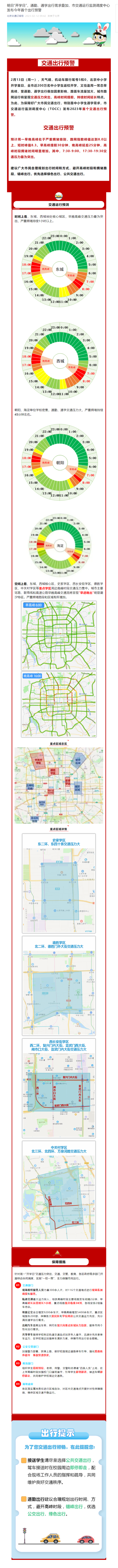 央視網(wǎng)消息:據(jù)“北京交通訂閱號(hào)”微信公眾號(hào)消息,2月13日(周一),天氣晴,機(jī)動(dòng)車限行尾號(hào)5和0,北京中小學(xué)開學(xué)首日,全市近200萬(wàn)名中小學(xué)生返校開學(xué),又恰逢周一常態(tài)早高峰,受通勤、通學(xué)出行疊加因素影響,路面車流量加大,城市路網(wǎng)運(yùn)行將呈現(xiàn)交通壓力突出,高峰時(shí)間提前,持續(xù)時(shí)間延長(zhǎng)特點(diǎn)。為此,為保障好廣大市民交通出行,特別是中小學(xué)生通學(xué)需求,市交通運(yùn)行監(jiān)測(cè)調(diào)度中心(TOCC)發(fā)布2023年首個(gè)交通出行預(yù)警。