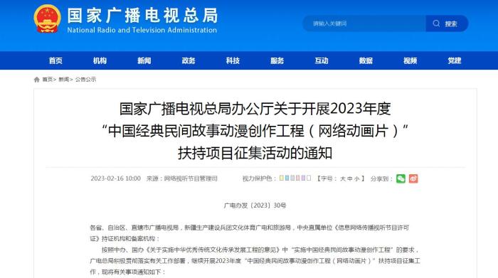 中新網(wǎng)2月16日電 16日,國家廣播電視總局辦公廳發(fā)布關(guān)于開展2023年度“中國經(jīng)典民間故事動(dòng)漫創(chuàng)作工程(網(wǎng)絡(luò)動(dòng)畫片)”扶持項(xiàng)目征集活動(dòng)的通知,旨在打造廣受觀眾認(rèn)可、具有較大影響力的優(yōu)秀作品。