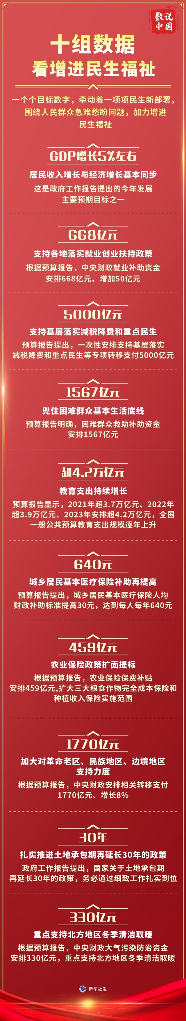 翻開5日提請第十四屆全國人民代表大會第一次會議審議的政府工作報告和提請審查的計劃報告、預算報告,一個個目標數字,牽動著一項項民生新部署,圍繞人民群眾急難愁盼問題,加力增進民生福祉。